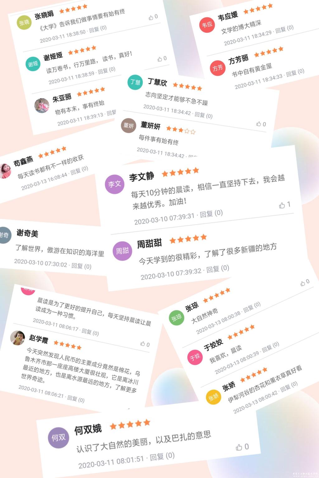 俗话说,一年之计在于春,一日之计在于晨,读万卷书,行万里路。为了更好地培养学生多读书,读好书的习惯。每天清晨七点半,晨读提醒会准时推送到学生的手机上。试读第一期推出的内容为航拍中国和《大学》第一章。疫情当前,丝毫没有影响同学们读书的热情。晨读活动一经推出,同学们积极踊跃参与,首日晨读完成率就达到了80.88,试读四天同学们填写了1598份读书日志、发表了2157条评论,好评率达98.82。