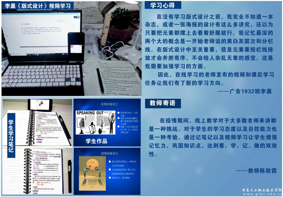 本次线上教学与课表进度保持了同步,自己登陆学习软件,在规定的时间内签到、教师布置学习任务。在学习过程中,老师进行答疑,进行过程监控,学习效果也很好。线上教学对自我管理能力要求更高,更加增强了我们自主学习的能力,培养了我们自主学习的精神,让我们通过自主学习,主动寻找问题,更充分的利用网络资源。上网课让我学会了自己管理自己。