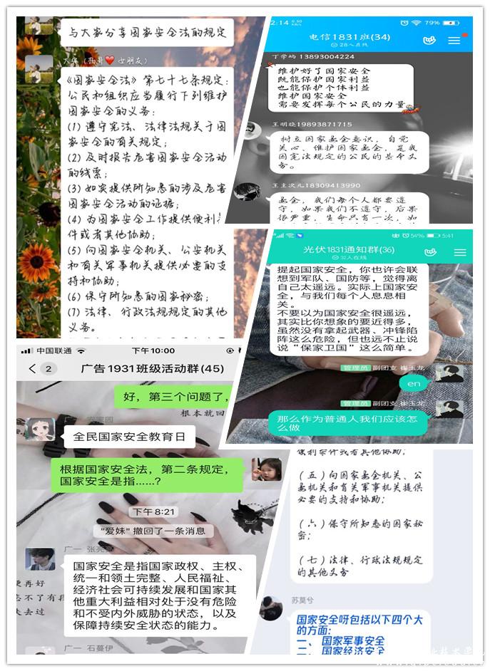 线上学习过程中,各团支部紧紧围绕主题展开热烈讨论,同学们不仅进一步接触和了解到国家安全方面的法律知识,特别是懂得如何依法履行自身的维护国家安全方面的职责和义务;同时也进一步增强了爱国意识和国家安全意识。大家纷纷表示,维护国家安全与每个人的切身利益密切相关,国家安全离我们并不遥远,只有人人参与、人人负责,国家安全才能真正获得巨大的基础和坚实的保障。作为新时代的青年,要把学到的国家安全知识告诉身边的人,宣传到力所能及的地方,要为守护国家安全尽一份自己的力量。