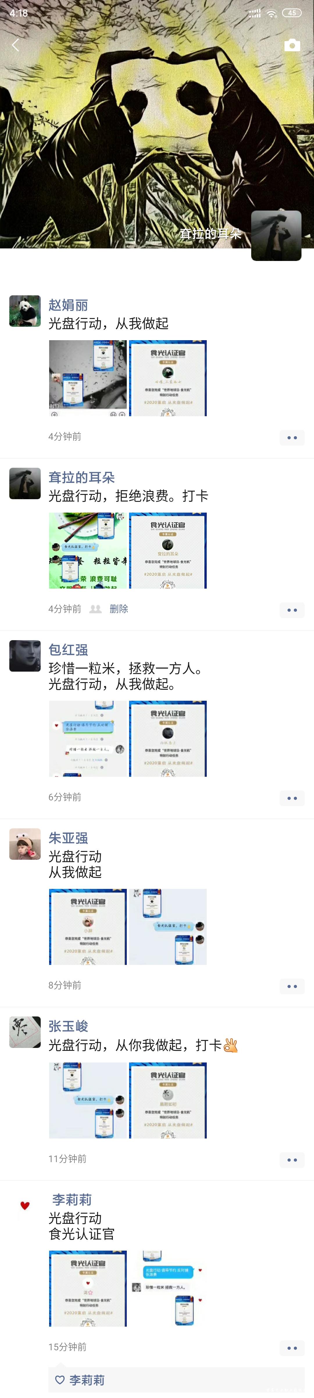 此次活动主要采用线上宣传的方式开展,依托QQ、微信等线上平台进行。邀请了同学们在“光盘打卡”微信小程序参与“光盘行动”互动。班级群里热烈开展了如何进行“光盘行动”的讨论、完成了光盘打卡任务、将认证证书以及光盘照片在朋友圈、QQ空间,微博等平台上传,邀请好友进行活动接力和宣传。