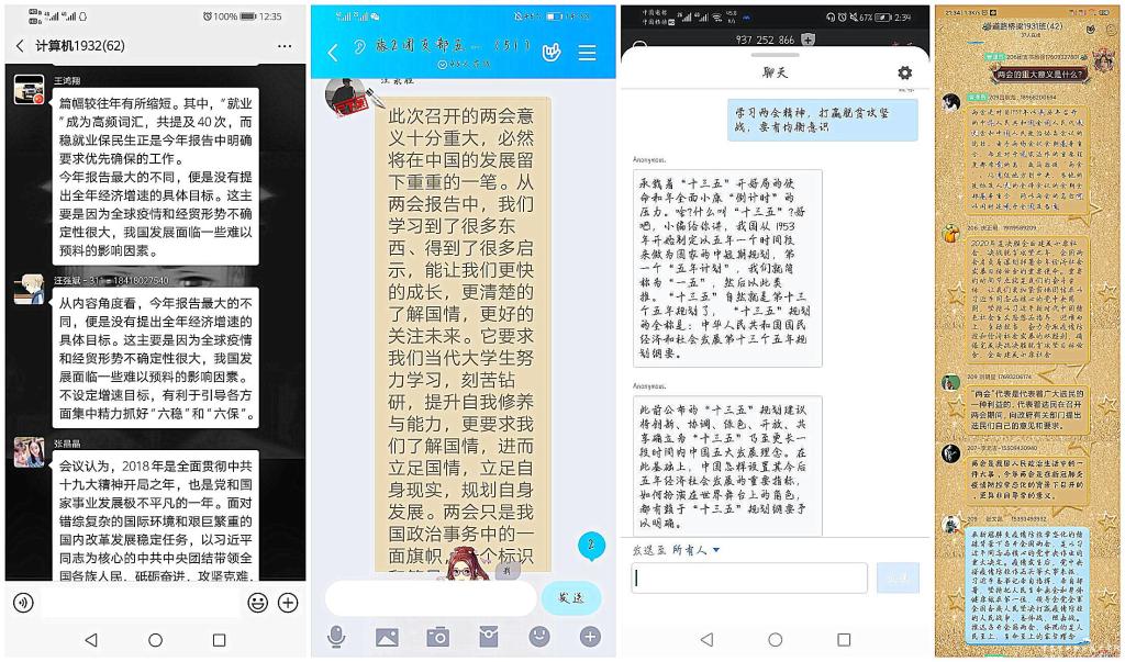本次学习的“两会”精神主要内容有审议《2020年政府工作报告》和《国民经济和社会发展“十三五”规划纲要》,政府将对外公布今年的工作目标、政策,以及未来五年的经济工作方向。通过认真学习,同学们深入了解了我国国内形式,进一步的理解和认识“两会”传递出的重要思想,此次盛会更加坚定了各族人民的信心和勇气;同学们纷纷表示,在日常生活中也会更加自觉实践两会精神,努力承担自己的社会责任。