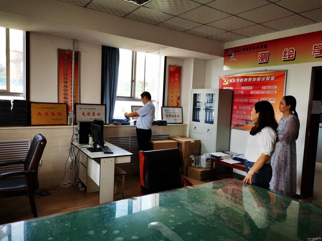 测绘学院院长王利军,副院长杨爱琴,副书记高霞对测绘学院学管办公室、测绘仪器实训室、多功能航空摄影测量模拟教学实训室进行安全大检查,重点检查了各项安全生产管理制度和安全责任落实情况,针对实训室消防安全情况、水源、火源、电源的管理情况和运行情况进行了检查;同时强调了对实训室安全操作规程和实训室(库房)物品“采购登记、保管登记、领用登记”制度的落实情况,现场评估了实训室物品、设备、器材等流失和被盗的安全风险,对各类事故隐患提出了针对性整改措施。
