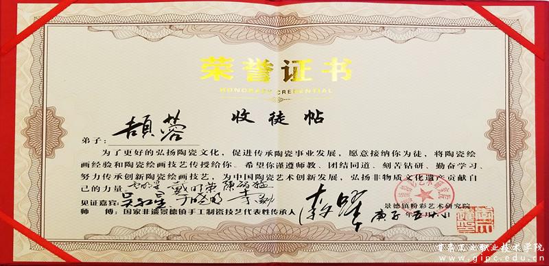 拜师程序结束,李文跃教授向弟子颉蓉颁发证书并寄语:“薪火相传、不辱使命。”勉励颉蓉老师一定要发扬老一辈艺术家不怕苦不怕累的精神,虚心学习,刻苦钻研技艺,在传承中华民族优秀传统文化方面为学校和社会多做贡献。不断提升瓷画技能,青出于蓝而胜于蓝,在手工制瓷技艺这个大舞台上闯出属于自己的天地。