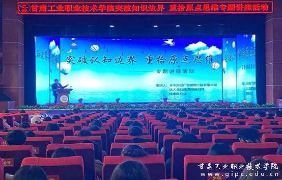 11月11日,在大学生活动中心举行由天水天创广告装饰工程有限公司总经理陈秉良带来的“突破认知边界 重拾原地思维”讲座。陈秉良用他自己从最初的创业到现在十几年的经历使学生们懂得了在学习和工作中要大胆假设,小心求证,善于打破常规,积极创新。