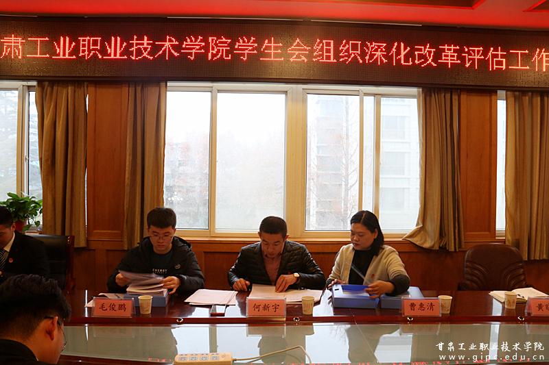 会上,校学生会执行主席张强作了《甘肃工业职业技术学院学生会组织深化改革工作自评报告》,从明确职能定位、改革运行机制、坚持精简原则、明确遴选条件、严格遴选程序、规范召开学生代表大会、坚持从严治会、建立述职评议制度、落实党委的全面领导、加强团委的具体指导、和下一步工作打算等11个方面就Beat365学生会组织深化改革情况进行了详细汇报。