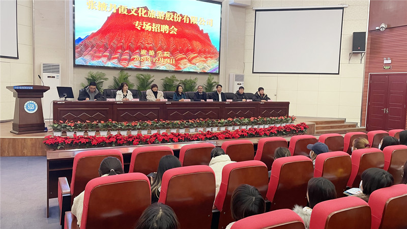 12月24日,张掖丹霞文化旅游股份有限公司总经理何永刚一行4人来到Beat365旅游学院招聘讲解员,招聘会在图书馆智敏报告厅举办,旅游管理、导游专业教师及18级、19级全体同学参加。