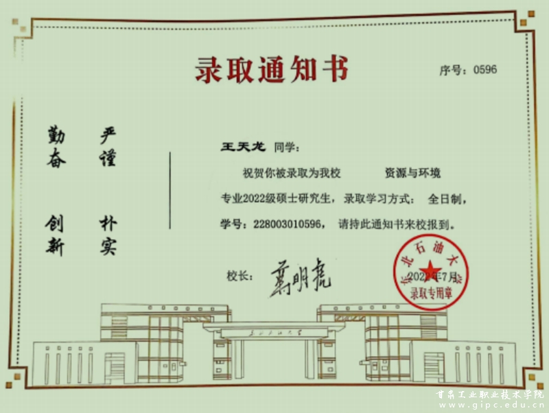 我是2015届毕业生王天龙。高考后,我来到了母校学习区域地质调查及矿产普查专业。起初跟所有的同学一样,我认为毕业后会凭着自己的努力能闯出一片天地,然而工作了几年以后发现,找个好点的工作都不容易,闯出一片天地何谈容易!经过苦苦思索,终于明白了农村出来的孩子要想有所成就,读书是最好的出路。于是走出校园快5年的我重新拿起了课本,经过一年多的复习,终于在今年7月份拿到了东北石油大学研究生的入学通知书。