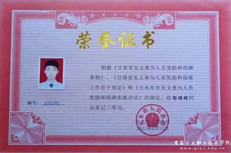 患有先天性心脏病的他,曾在去医院检查的时候见义勇为按住了劫持人质的醉汉,荣立天水市二等功。在此次救援活动过后依旧坚定地说道:哪里有灾难,我将奔赴在救援一线,险情就是命令,责任就是使命。郭博辉面对暴雨洪灾毫不犹豫、动身行动、逆行出征,充分体现了一名新时代合格大学生的责任与担当,是新时代青年的榜样。他用实际行动践行了“请党放心,强国有我”的青春誓言,正因如此,我们相信,洪水终将褪去,阳光再次普照大地,人间永不失去爱与勇气。