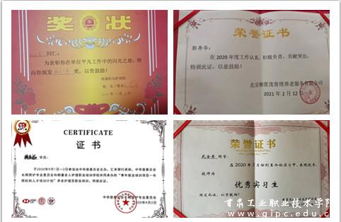 2018级老年服务与管理专业学生罗春梅代表实习单位在张掖市“大漠紫光杯”巾帼家政服务职业风采大赛中荣获养老护理组二等奖;崔艳艳、武金弟被实习单位椿萱茂北京亦庄老年公寓评为优秀实习生;扎玉美因工作认真负责、忠于职守,被实习单位南通阳光护理院颁发救人一命奖;郭奔华、路亚梅、后素瑞、唐小娟、李淑峰、梁红强、包耀强7名同学因工作出色表现、贡献突出被用人单位列为重点培养对象。