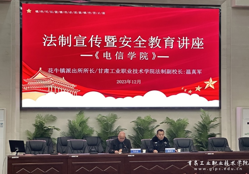 为进一步增强学生安全意识,帮助学生掌握基本的法律常识和安全知识,切实筑牢保障学生身心健康发展的安全防线,助力平安校园建设。12月14日,电信学院邀请天水市花牛镇派出所所长、甘肃工业职业技术学院法制副校长温真军在智敏学术报告厅开展法制安全教育讲座。电信学院师生参加。